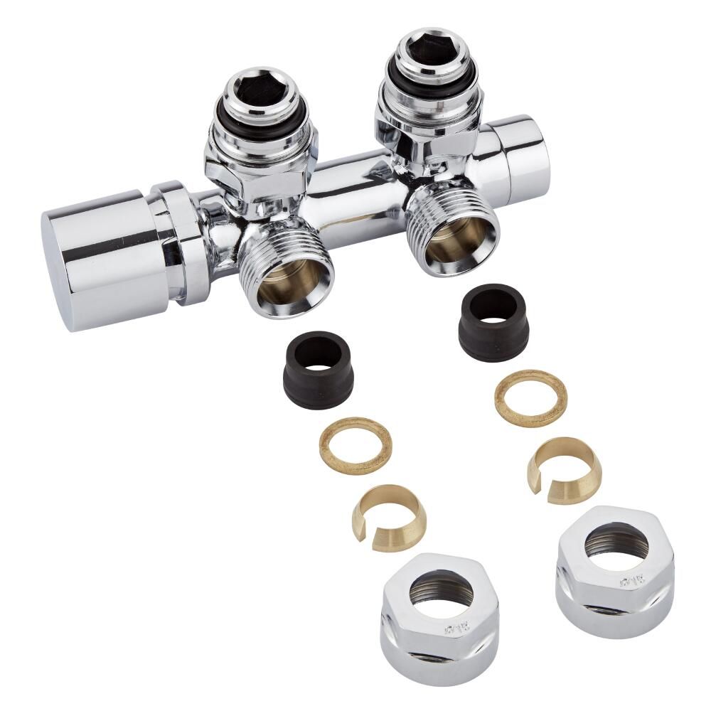 Made from hardwearing brass to guarantee long-lasting durability, this H-block radiator valve comes with a chrome hand wheel and a pair of 15mm copper adapters for added convenience.