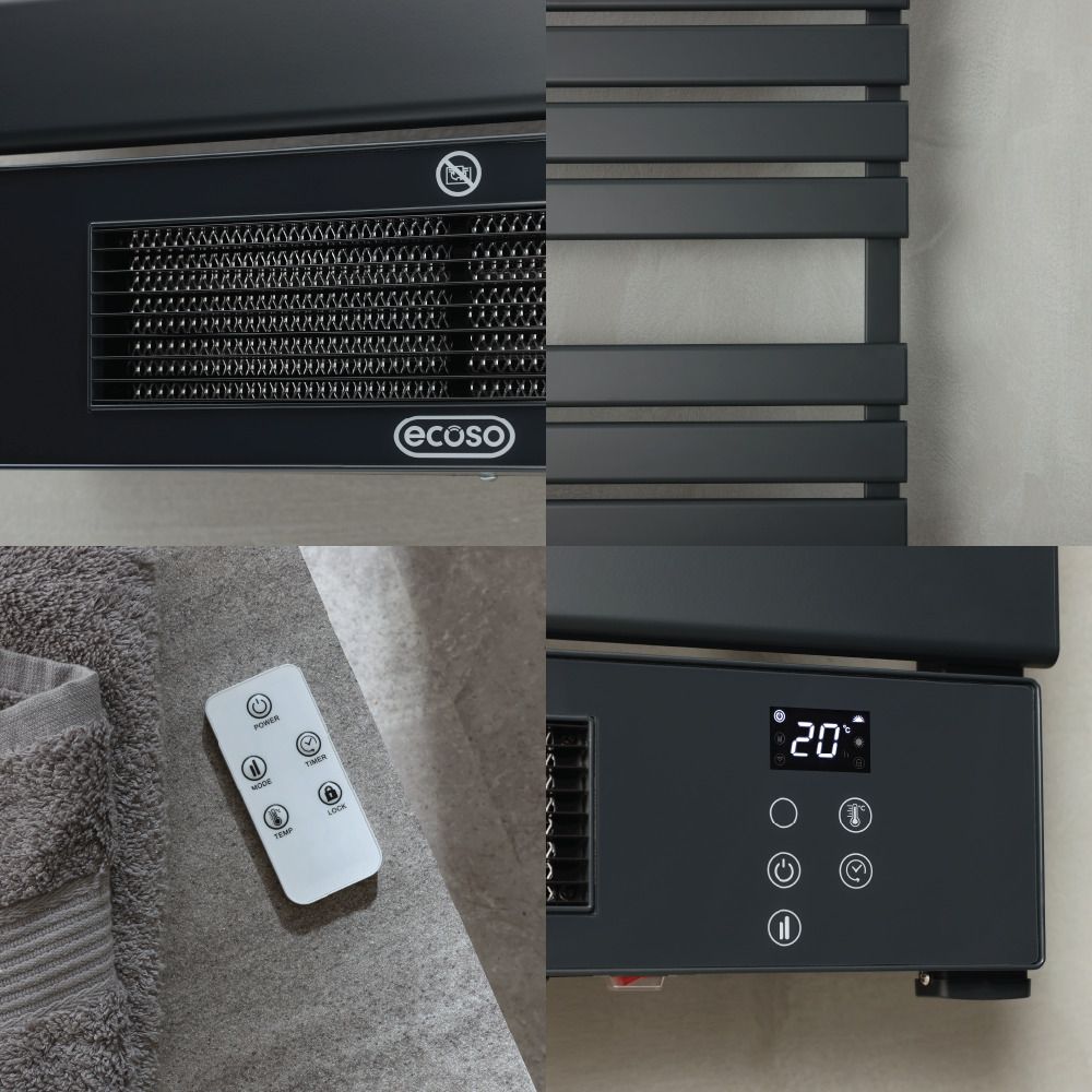 Heat up your bathroom space and towels with the energy efficient ECOSO Linus electric heated towel rail with fan. With Wi-Fi functionality, you can easily control the heat settings from anywhere on your phone when used with the free app.