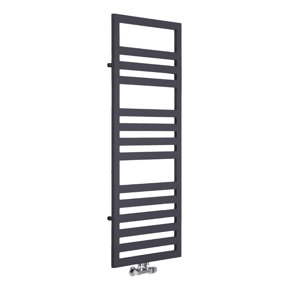 Made from hardwearing carbon steel to ensure long-lasting durability, this contemporary designer heated towel rail features middle connection valve inlets and a modern anthracite grey finish to instantly update the look of any bathroom space.