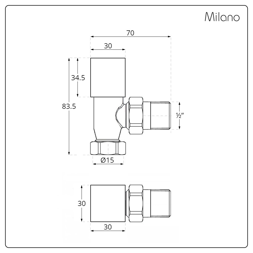 This pair of Milano square designer angled radiator valves feature a high quality chrome finish and provide the perfect way to complete and enhance the contemporary or designer style of your radiator or heated towel rail. These square designer angled radiator valves have a 1/2" thread and will fit all our radiators and heated towel rails. When fitted to your radiator these valves will add an approximate 120mm to the overall width of the appliance.