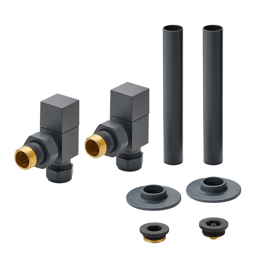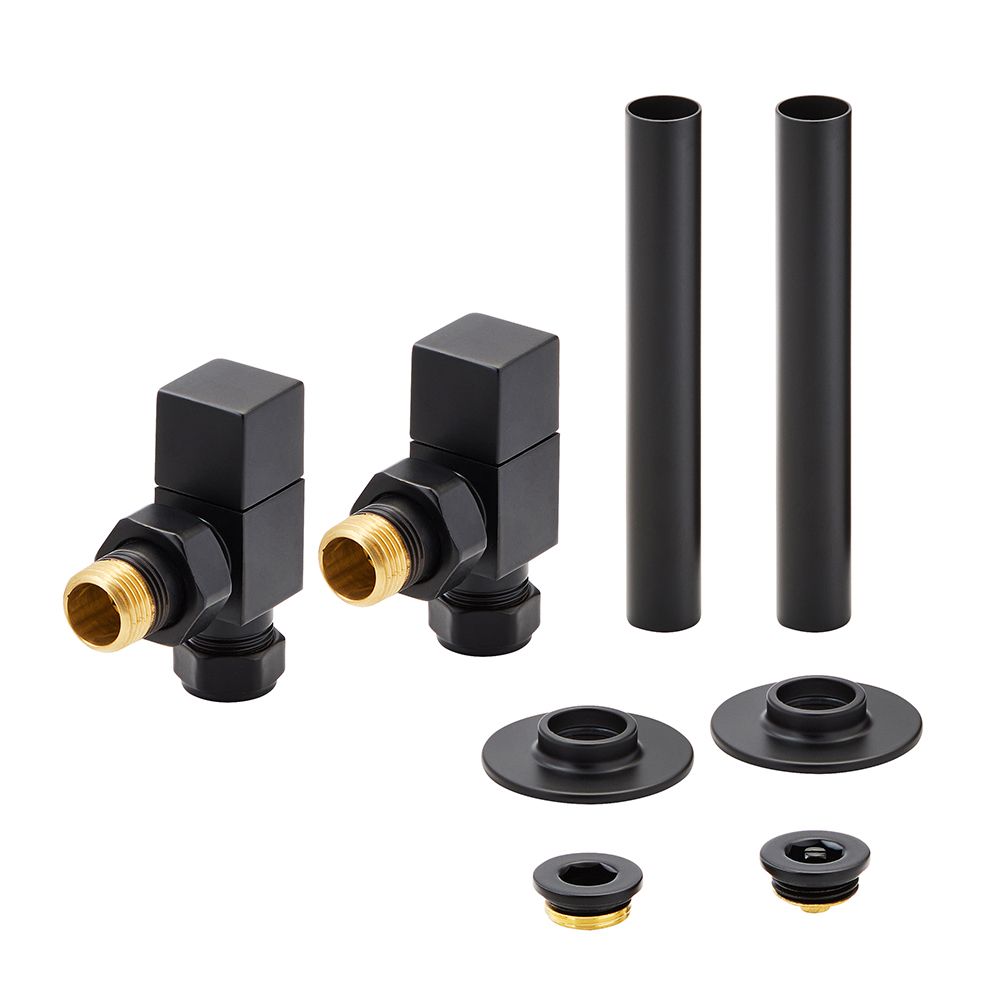 Milano - Modern Square Angled Radiator Valve and Pipe Sleeve Set - Choice of Finish